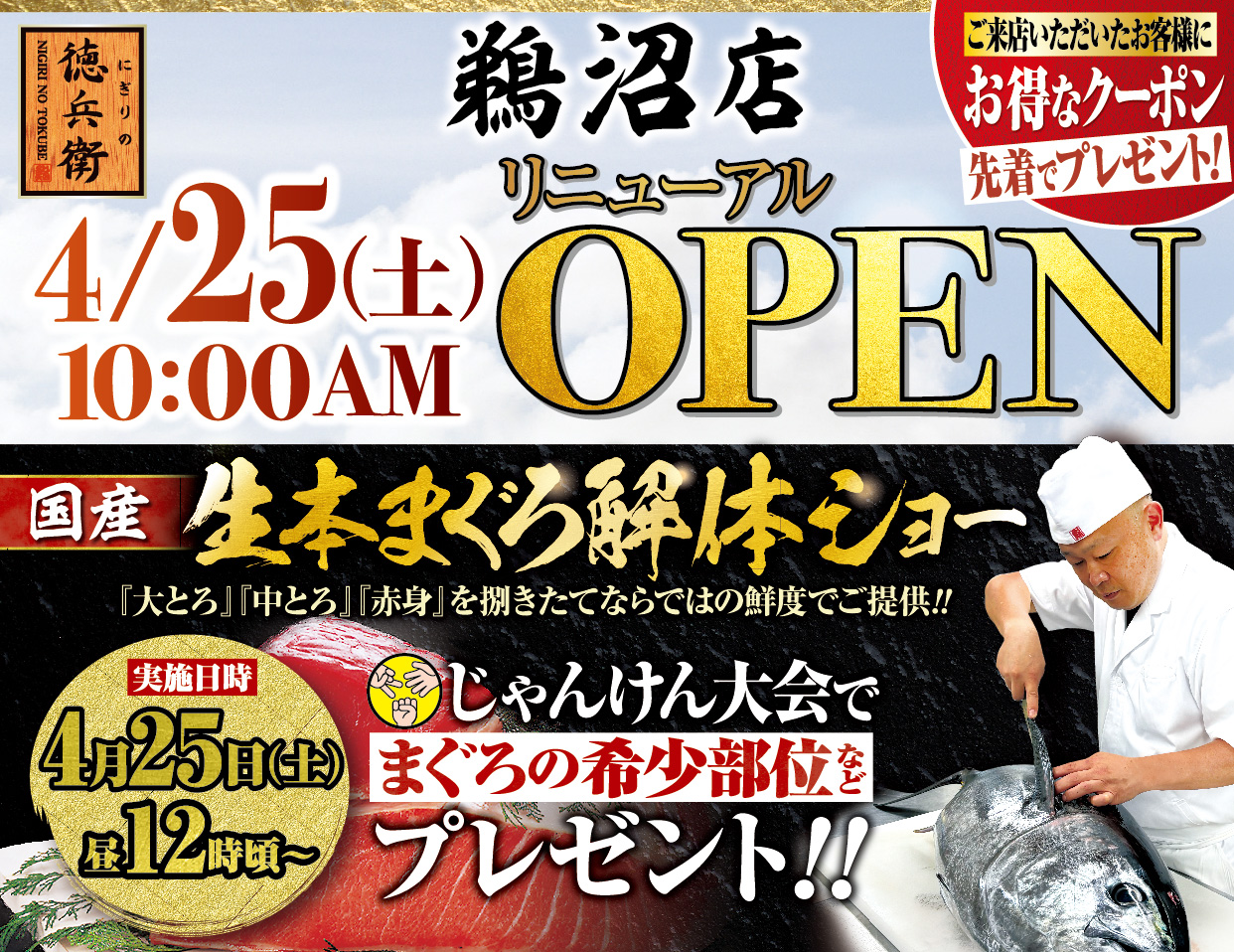 2026.04.17更新 GW(ゴールデンウィーク)お持ち帰りすし祭り2026年4月23日(木)~5月10日(日) 2026.04.16更新 【オープン情報】にぎりの徳兵衛 鵜沼店 4.25リニューアルオープン!2026年4月25日(土)リニューアルオープン 2026.04.15更新 【オープン情報】にぎりの徳兵衛 羽島店 4.18リニューアルオープン!2026年4月18日(土)リニューアルオープン 2026.04.07更新 【オープン情報】にぎりの徳兵衛 中村豊国店 4.12リニューアルオープン!2026年4月12日(日)リニューアルオープン 2026.04.07更新 【オープン情報】にぎりの徳兵衛 桑名五反田店 4.11リニューアルオープン!2026年4月11日(土)リニューアルオープン 2026.04.07更新 姫丼®・姫つつみ2026年4月7日(火)より販売開始 2026.04.07更新 キッズパスポート進呈《期間中いつでも何度でも半額!》配布期間:2026年4月7日(火)~8月31日(月) 2026.04.07更新 【4/25~5/10】毎朝10時00分オープン!2026年4月25日(土)~5月10日(日) 2026/04/01 【お詫びとお知らせ】赤かます塩〆炙り・チャンバラ貝の 欠品について 2026/03/19 【お詫びとお知らせ】海援鯛欠品について 2026/03/18 【徳兵衛の日】内容変更のお知らせ 一覧を見る 現在ニュースは登録がございません。