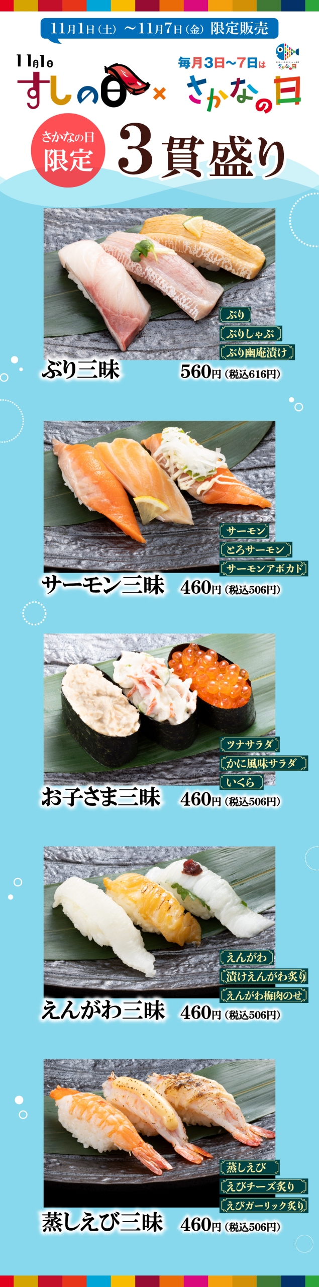《寿司の日×いいさかなの日》限定3貫盛りを5種類ご用意!