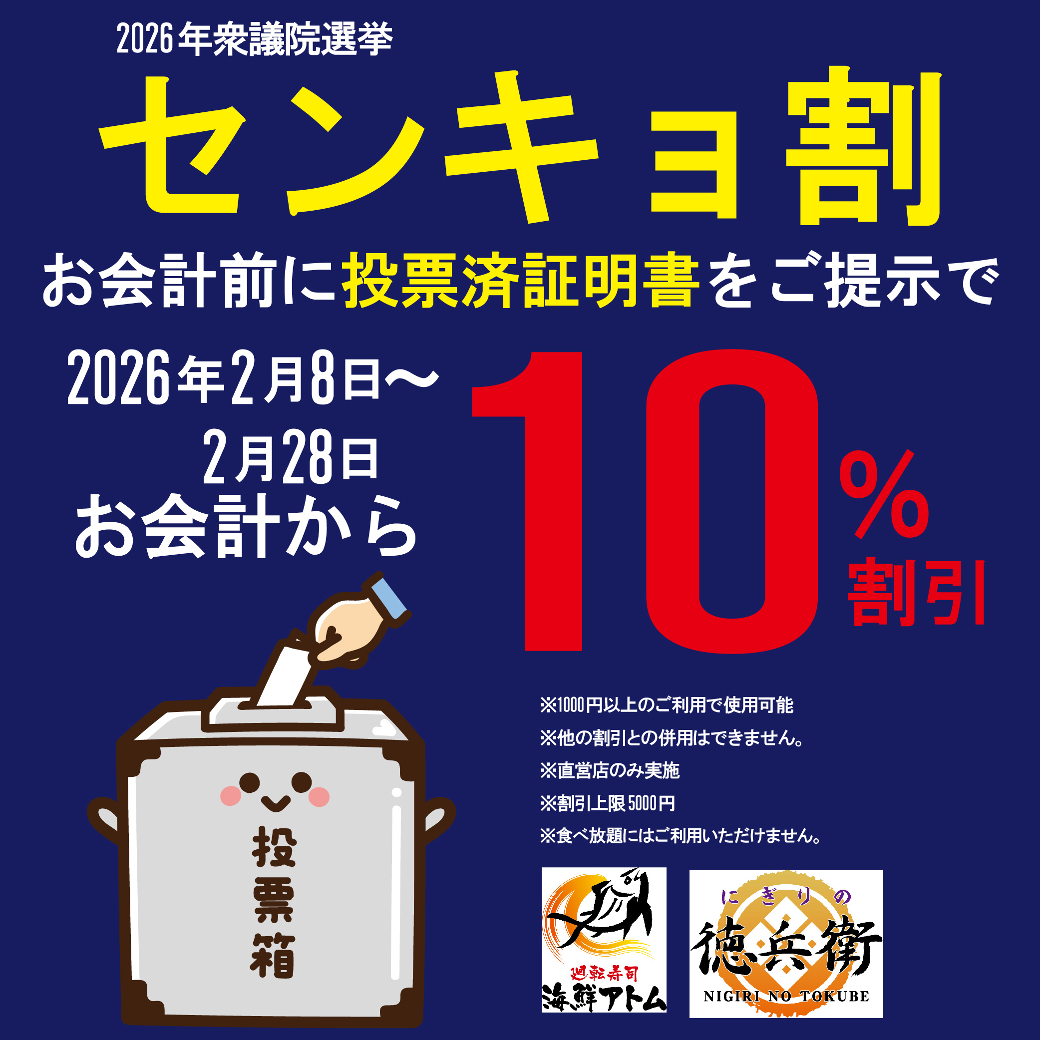 にぎりの徳兵衛、海鮮アトム各店で「センキョ割」を実施します!