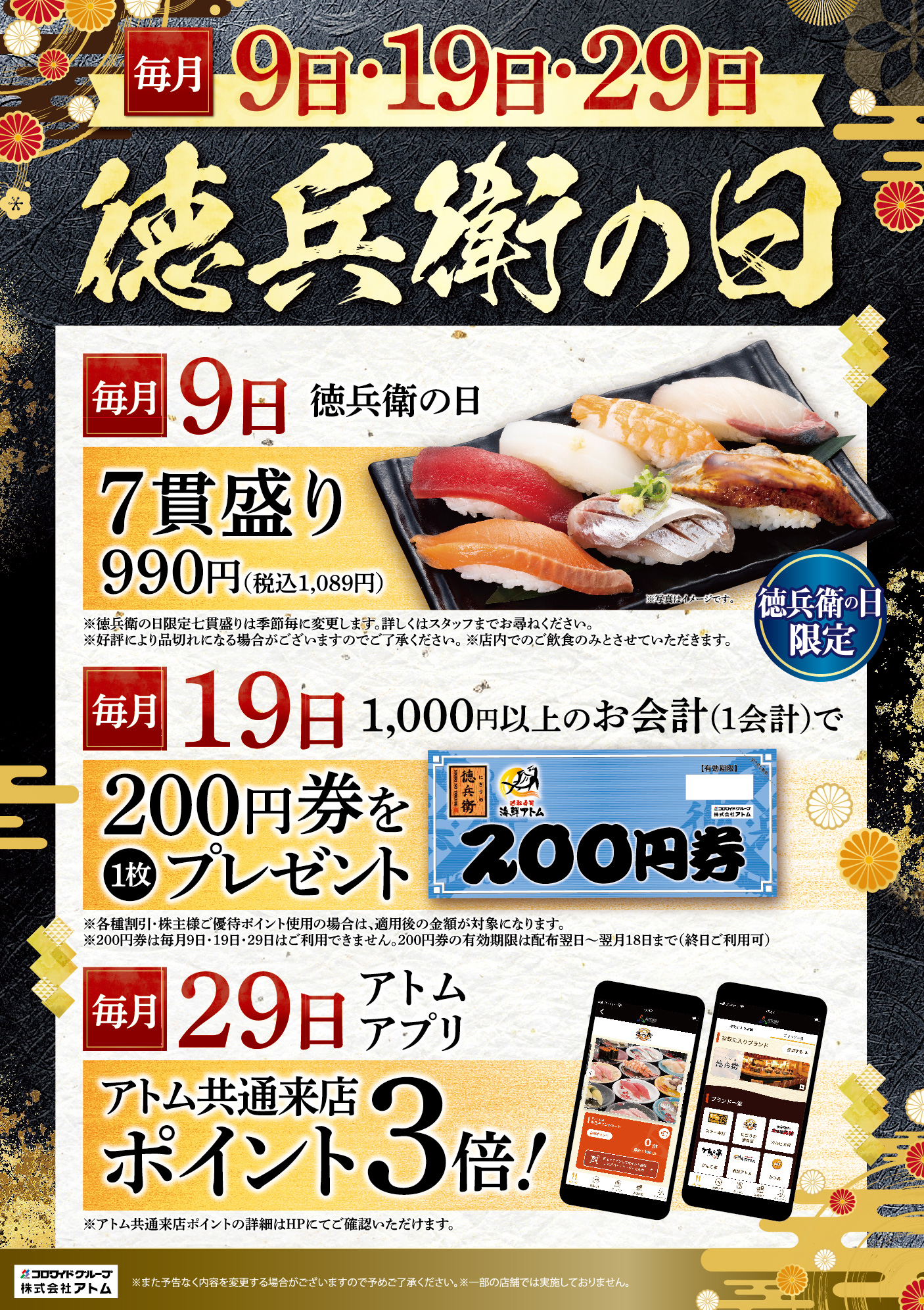 ただし富田店、天王店、扶桑店、関店、桑名店、今伊勢店、稲沢店ではアトムアプリを運用しておりませんので、毎月29日のサービス内容が上記内容と異なります。詳しくは店舗までお問い合わせください。