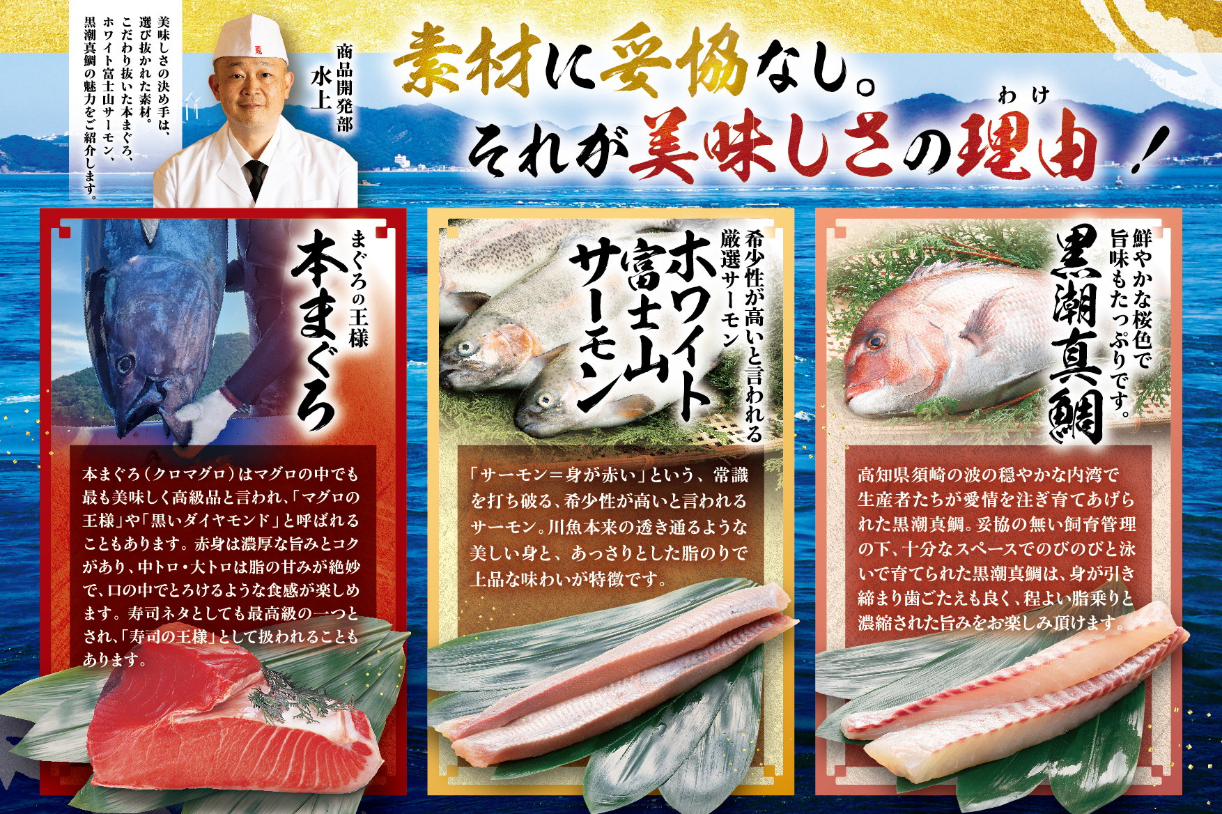 本フェアでは「紅白対決」と題し、赤身代表「本まぐろ」と、白身代表「ホワイト富士山サーモン」「黒潮真鯛」を使用した寿司盛り合わせを販売いたします。