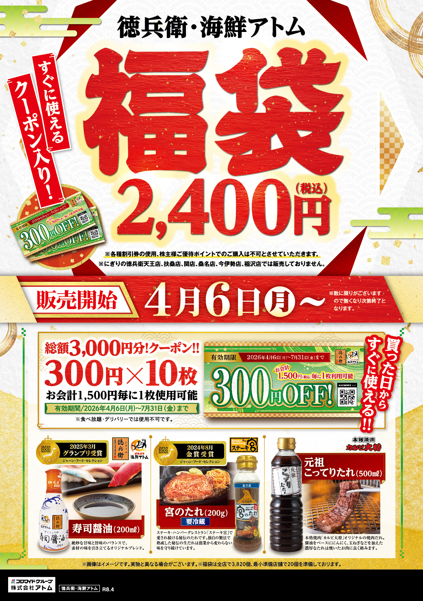 この機会に是非お近くの店舗でこの超お得な「徳兵衛・海鮮アトムの福袋」をゲットしてください。