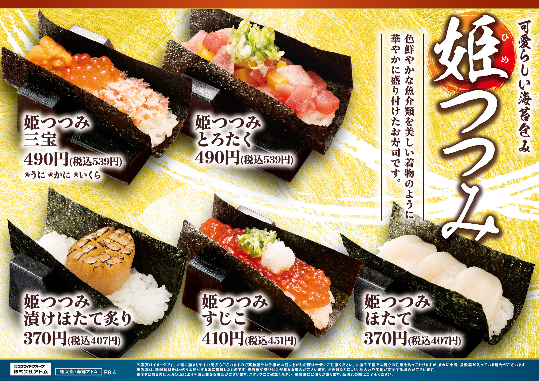 「姫つつみ」は色鮮やかな魚介類を美しい着物のように華やかに盛り付けた、二口サイズの可愛らしい海苔包みのお寿司です。