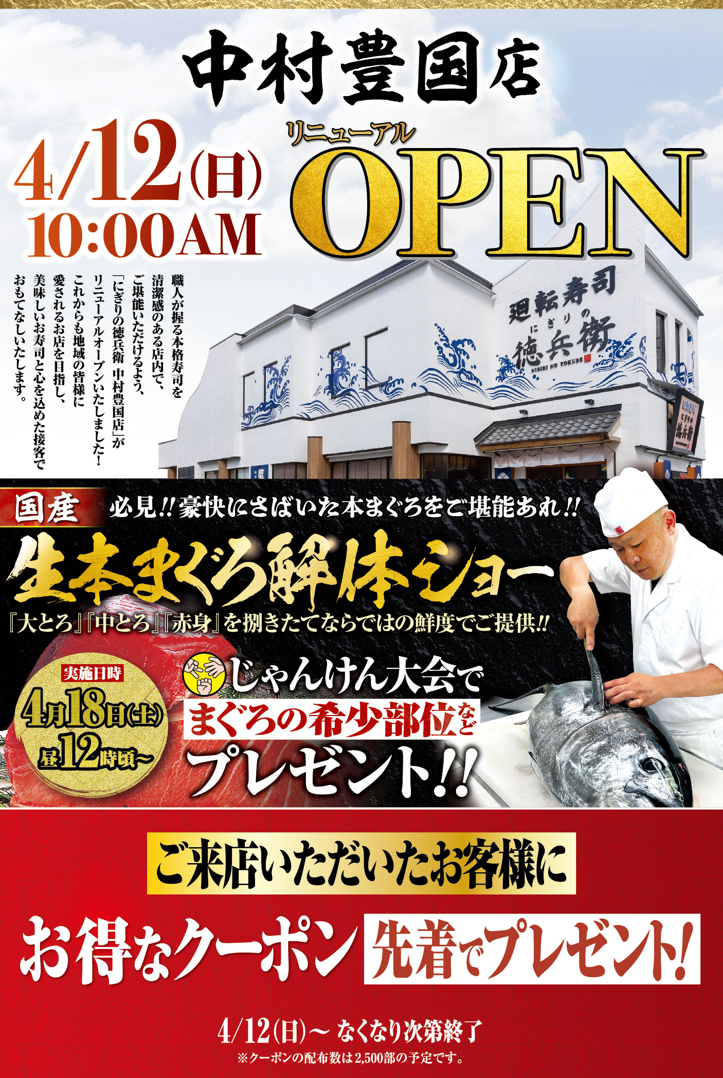 にぎりの徳兵衛 中村豊国店は4月12日(日)リニューアルオープン致します。