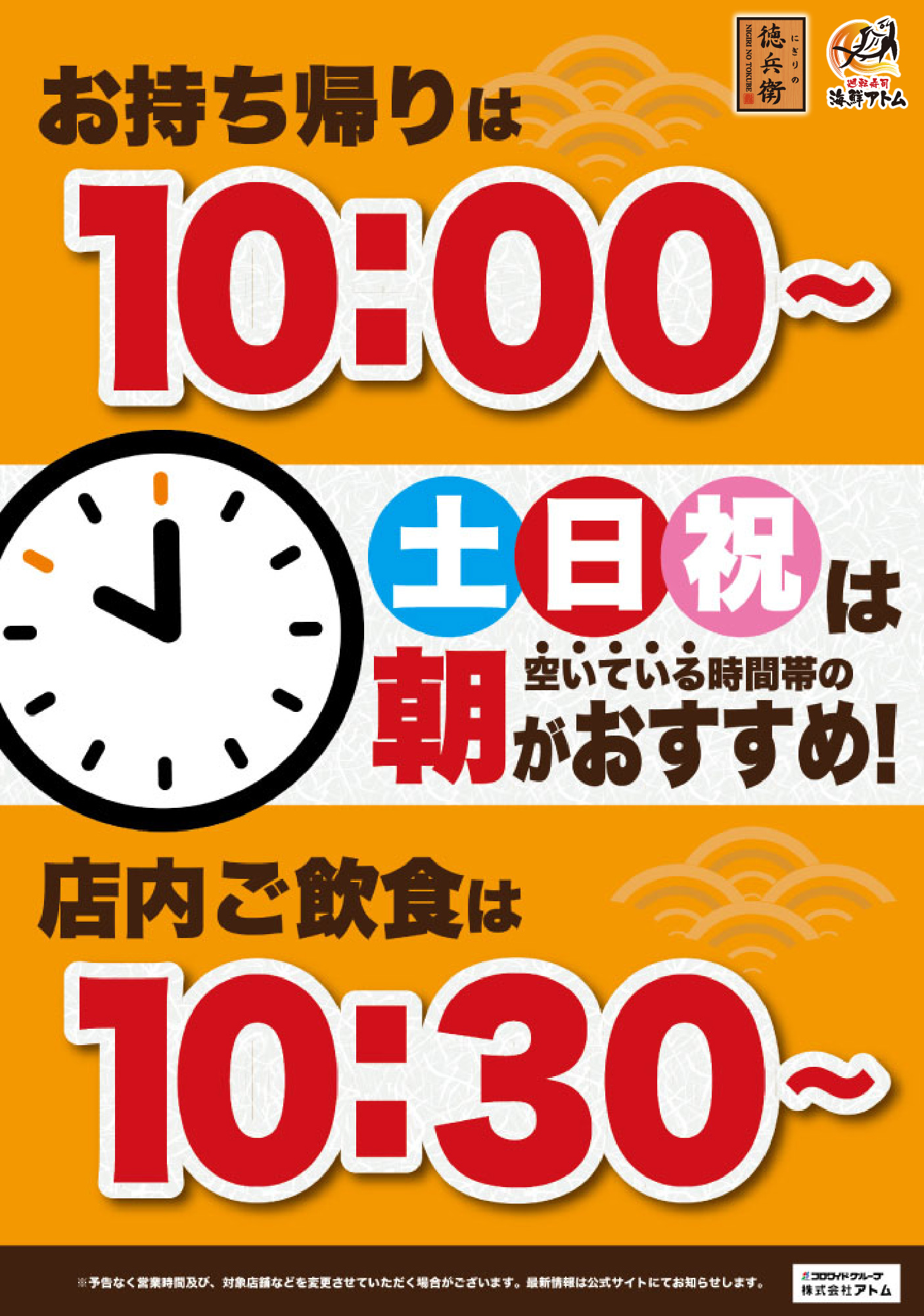 土日祝は朝がおすすめ!朝の営業時間拡大中・・・お知らせにぎりの徳兵衛TOP