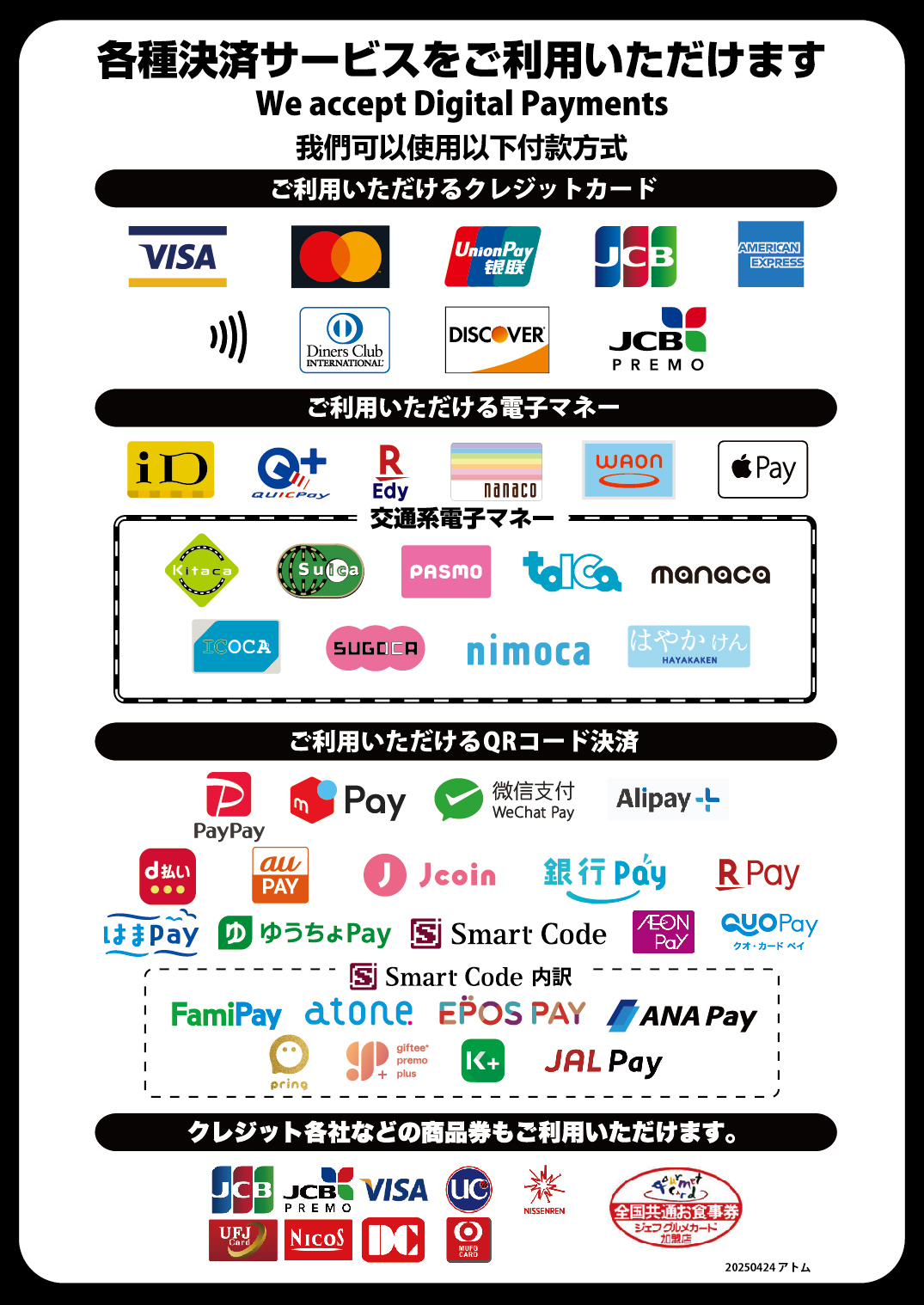 店頭では各種電子マネー・コード決済をご利用いただけます 。