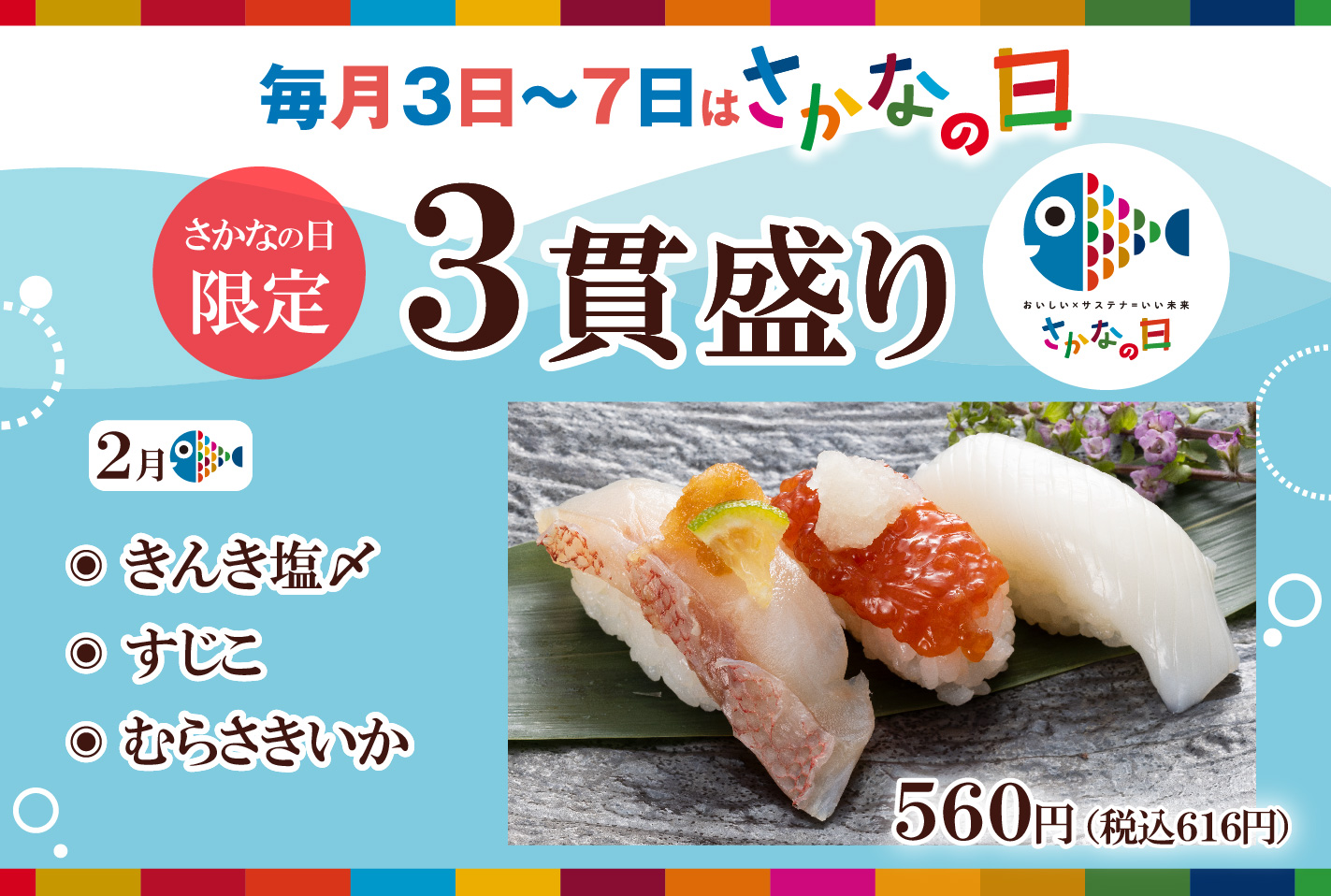 ※「さかなの日限定三貫盛り」は、桑名店、天王店、稲沢店では実施いたしません。