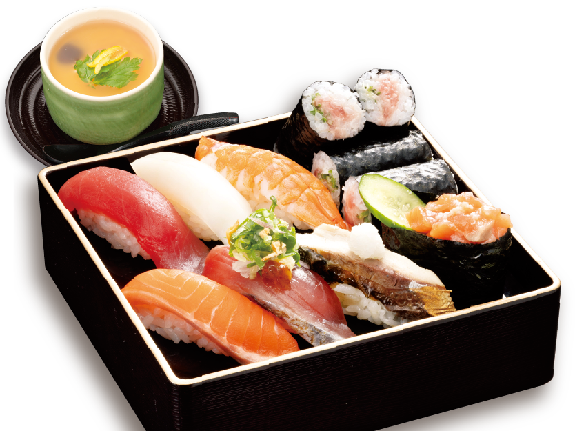- 鉄火巻き・かっぱ巻き・まぐろ・いか・蒸しえび・カニ風味サラダ・本日の貝・いなり・玉子・漬物小鉢・日替りデザート・茶碗蒸し