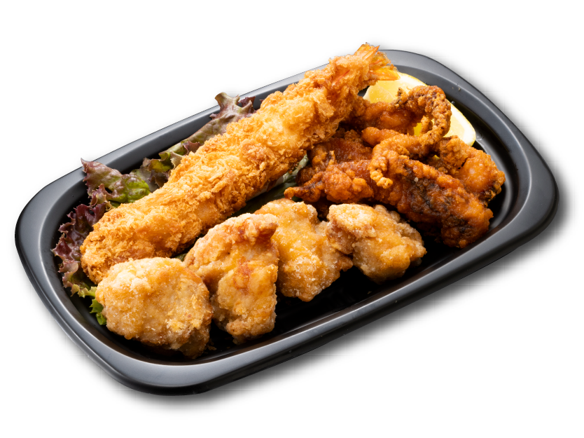 - エビフライ、鶏の唐揚げ、げその唐揚げ